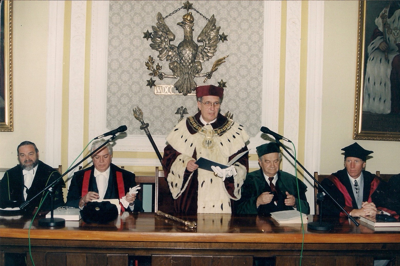 Profesor Roman Głowacki siedzi drugi od prawej, stoi profesor Włodzimierz Siwiński – rektor Uniwersytetu Warszawskiego w latach 1993-1999.